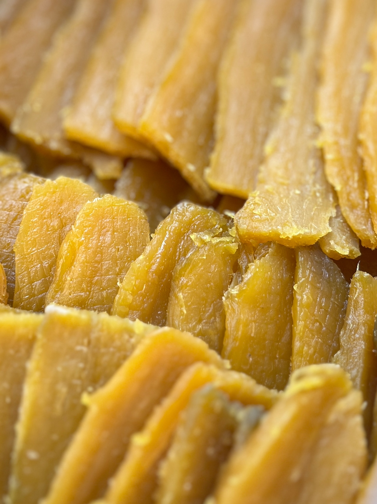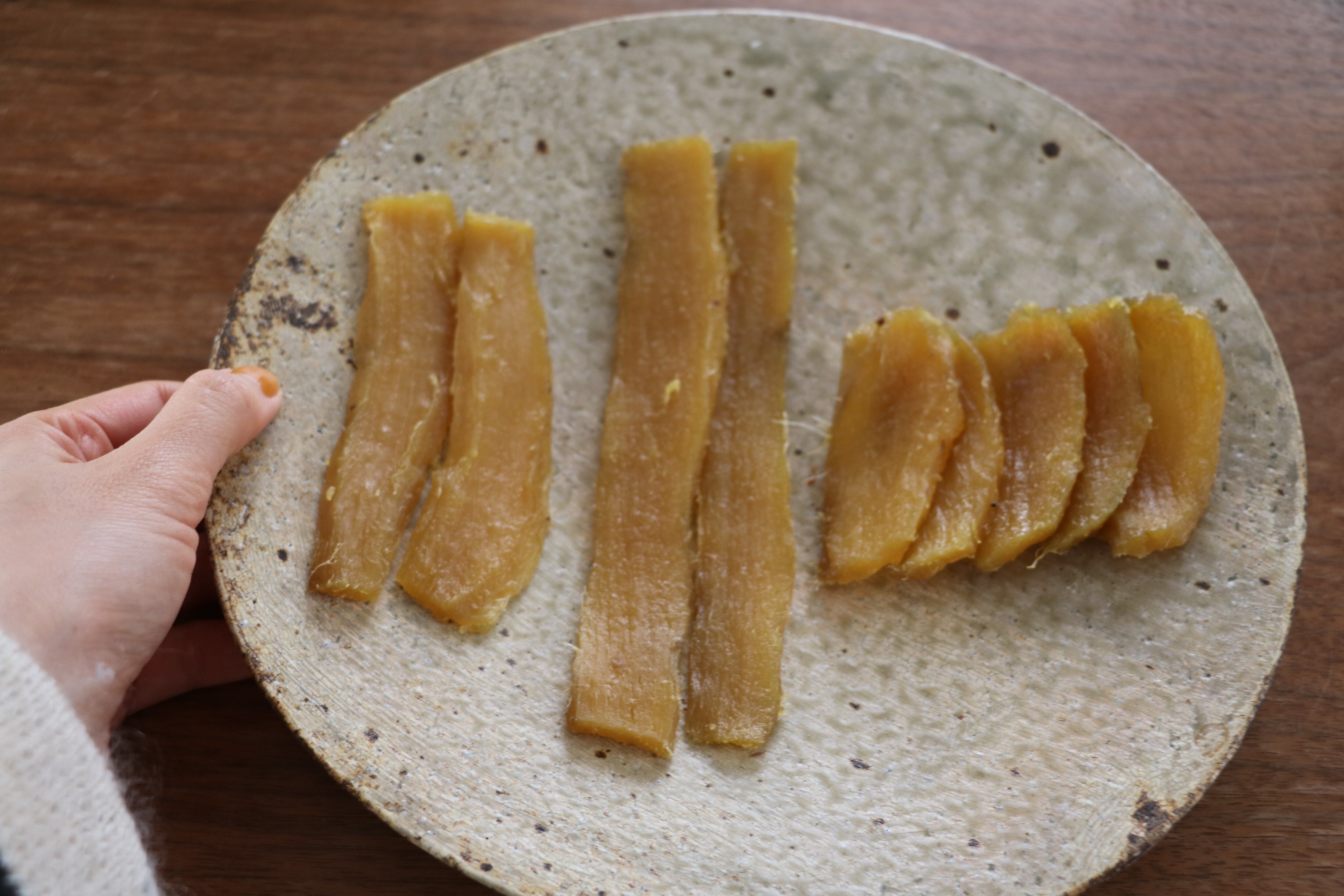 干し上がってすぐの干し芋はまだ粉が吹かずに透明で、