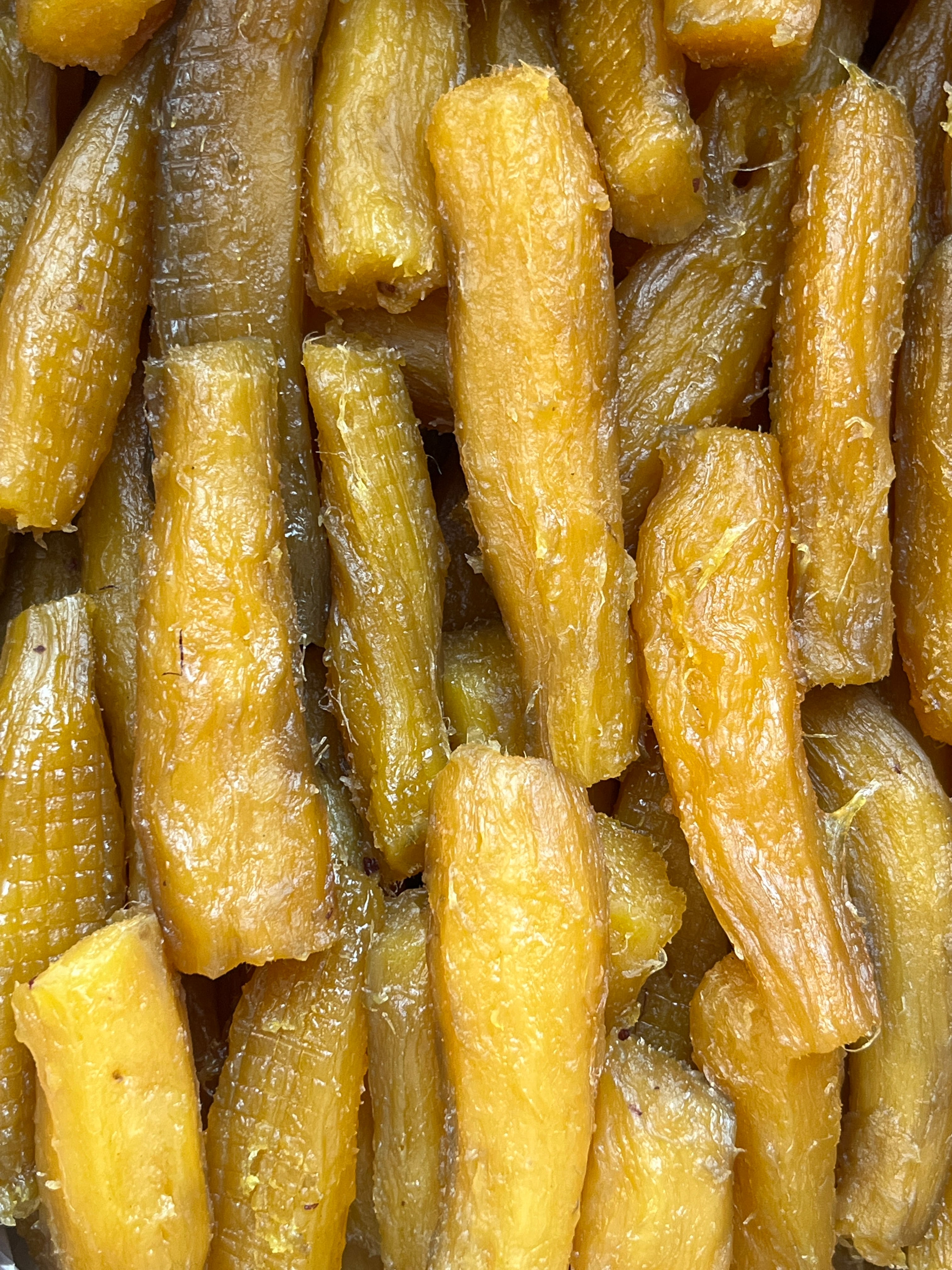 小さめのさつまいもを蒸して丸ごと干すため、乾燥方法も難しく時間も長くかかるので希少性の高い高級品。ねっとりとした食感をお楽しみください。しっとり仕上げているため水分量が多いので、賞味期限が早めになっています。お早めにお召し上がりください。
