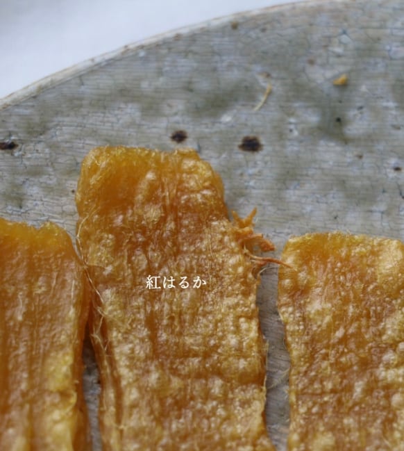 さつまいもの種類は「紅はるか」。薄くスライスした定番の「平干し(ひらぼし)」と、芋の姿そのままの「丸干し(まるぼし)」の2種類があります。