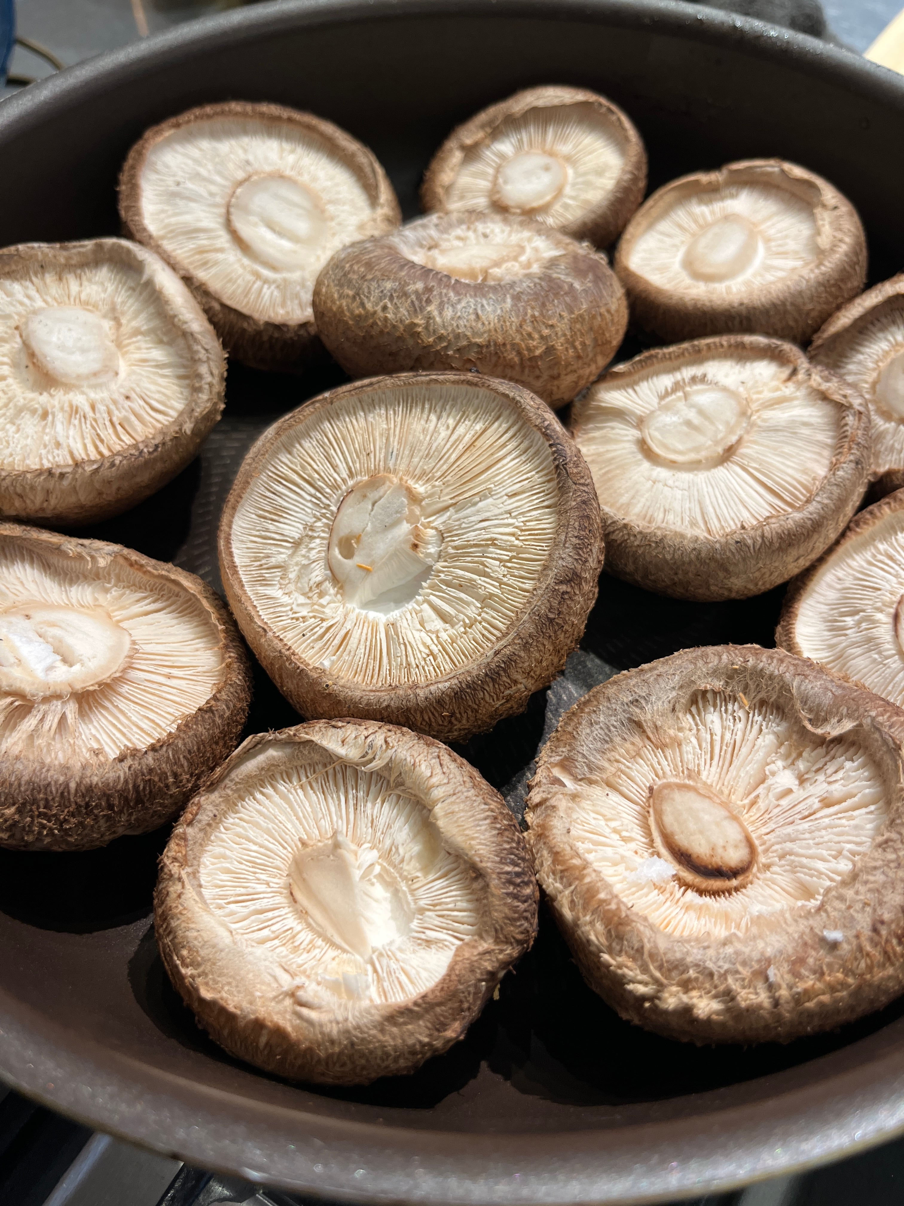 フライパンで油を引かずに焼いてください。軸を上に向けて傘のヒダ部分に少し塩をして、蓋をして焼きます。蓋を開けた時に広がる椎茸の香りと言ったら!レモンを絞ってどうぞ。「軸」も食感が良く噛むほどに味が出てくるので、細く切ってオリーブオイルで炒めて塩をパラリと振るだけでもご馳走になります。